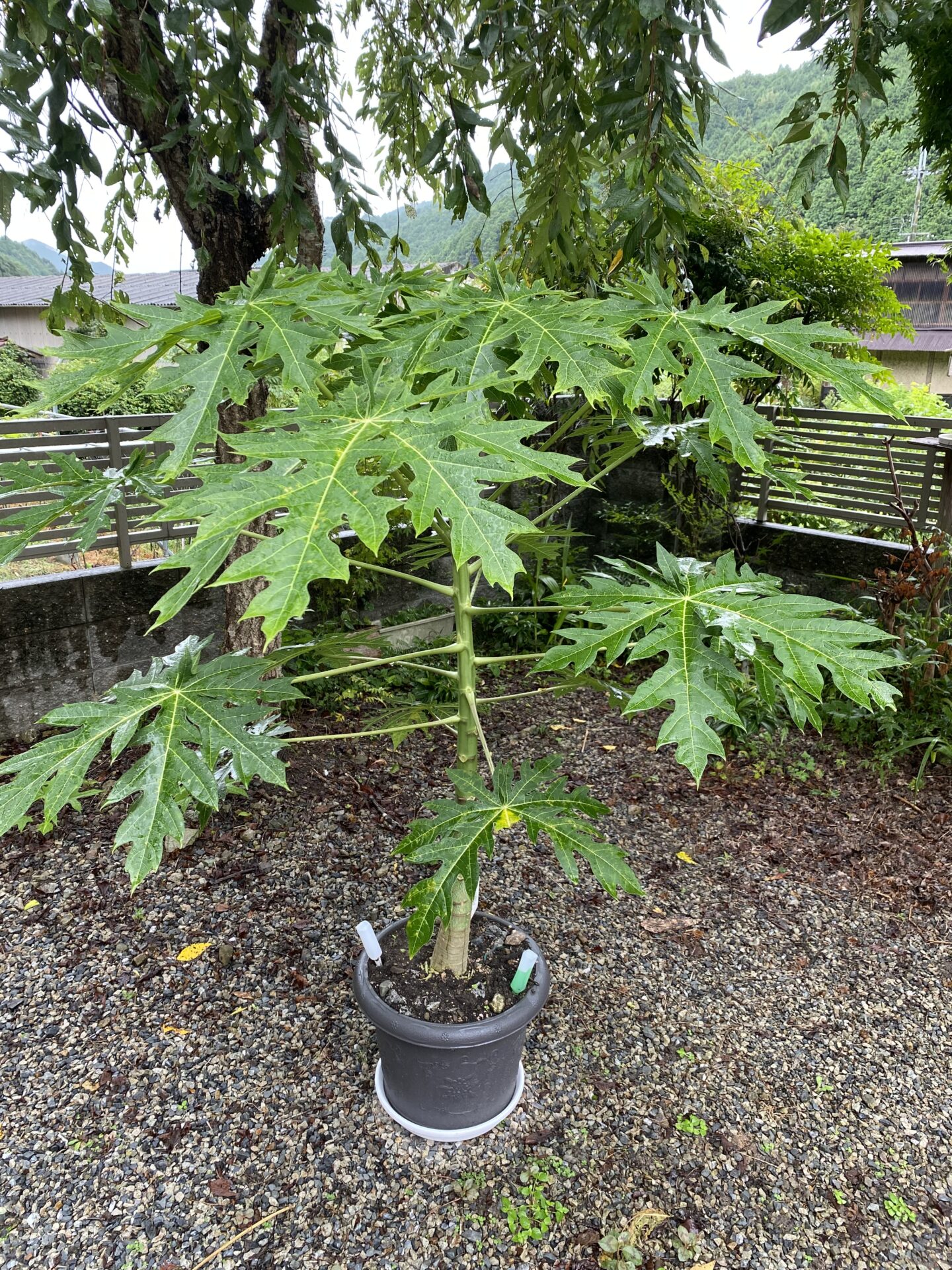 皆さんこんにちは。ご無沙汰しております。連日危険な暑さが続いていますがいかがお過ごしでしょうか。熱中症予防に心掛けて頂きたいと思います。又、週末にかけて勢力の強い台風10号が近づいております。当店も状況によっては臨時休業を予定しています。ところで6月頃にホームセンターで「パパイヤ」の苗木(1m)を購入し現在は1.6m程に育ちましたが、雌株ではなく雄株のようで残念ながら実がならないようです。観賞用に庭に置いておきますのご覧ください。